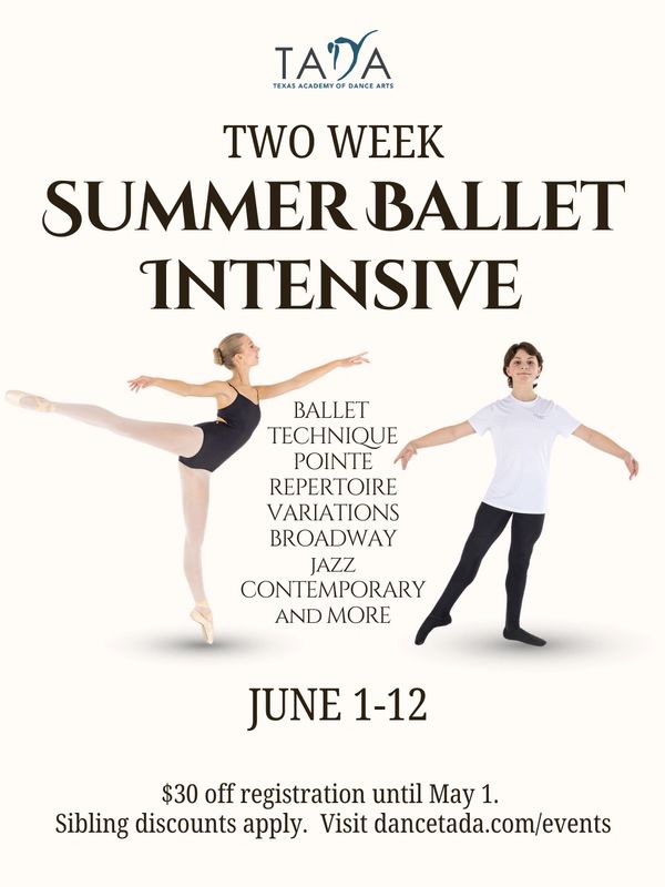 Sign up by May 20 and enjoy big savings and sibling discounts on Dance Camp TADA, perfect for ages 4-7! Four sessions: June 9-11, June 23-25, July 7-9, and July 21-23. Let's dance!
