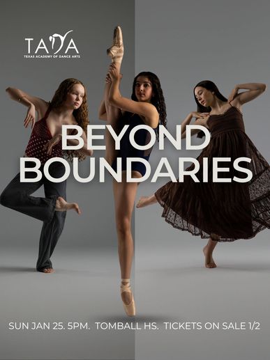 Our annual Beyond Boundaries concert is a collaborative performance featuring all of TADA's programs, including our Pre-Professional Program, Youth Ballet Company, Team TADA, and Showstoppers dancers. This multi-genre performance will showcase Stunning works by guest choreographers and TADA faculty. The concert will be one night only at Tomball High School Theater on Sunday Jan 25th, 5pm. Tickets are available beginning Jan 2.
