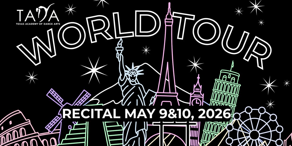 Ready, set, let's jet! Join us at our 12th annual recital as we zip around the world! We are so excited to present to you TADA's "World Tour" on May 9-10, 2026 at Tomball High School Theater, featuring music about countries and cultures all across the globe! Tickets will go on sale April 1st at 10am right here. Right now, there are a few things you can do in prep for your dancer(s) big day - scroll down for: