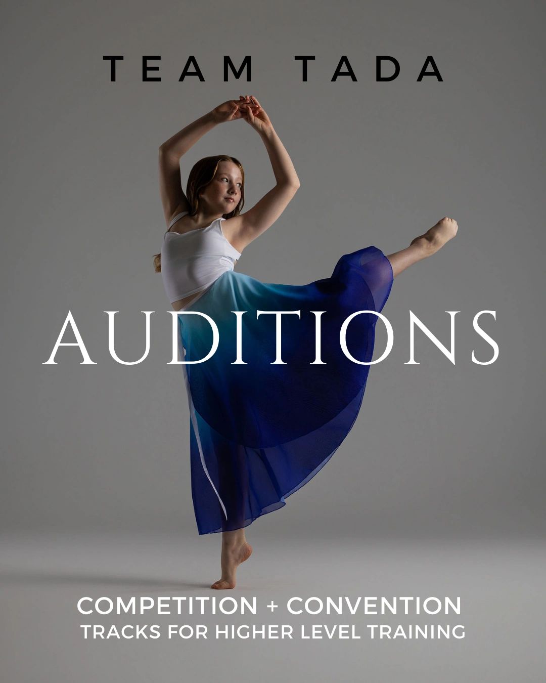 Team TADA is our competition & convention team for dancers focused on a future in collegiate, industrial, or professional company dance. Our well-rounded dancers train extensively in ballet, jazz, contemporary, modern, hip hop, ballroom, and more, and gain access to the best teachers in the industry through master classes, contracted guest artists, and choreographed works. While developing physical skill and talent is important, our competitive program also emphasizes the values of teamwork, responsibility, humility, confidence, leadership, discipline, charity, and more - values that will help them throughout the many facets of life.